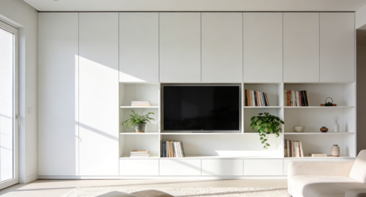 复杂的大理石、金属线条背景墙已显笨重。如今更流行整面收纳墙或简约留白。将电视嵌入通顶收纳柜,或直接使用纯色墙面,既能扩大视觉空间,也赋予了未来改造的更多可能性。